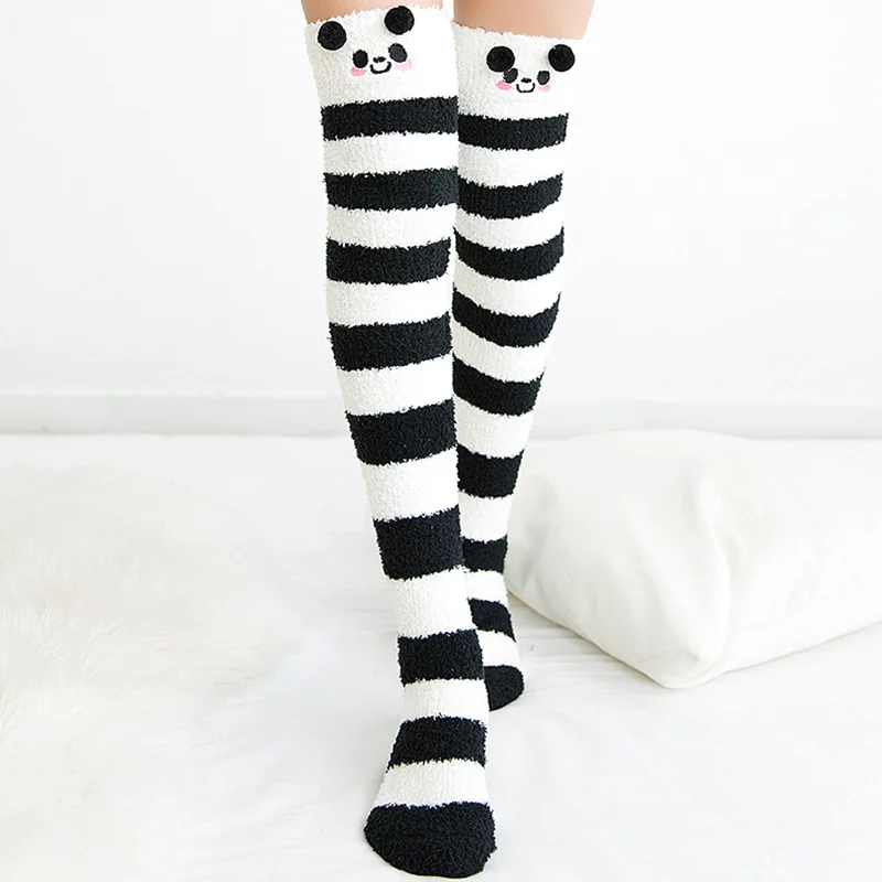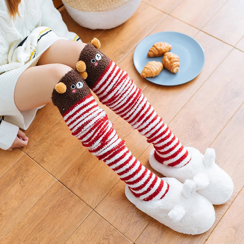 1 paire mode fille mignon hiver rayé corail velours longues chaussettes chaud genou longueur chaussettes mignon ours mouton maison serviette bas