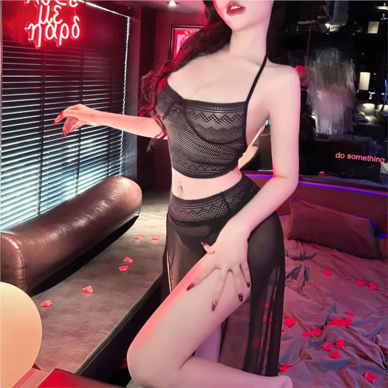 Lace bra transparent slit long skirt hanging neck strap sexy lingerie woman erotic Babydolls toys femme dress sexy pajama set