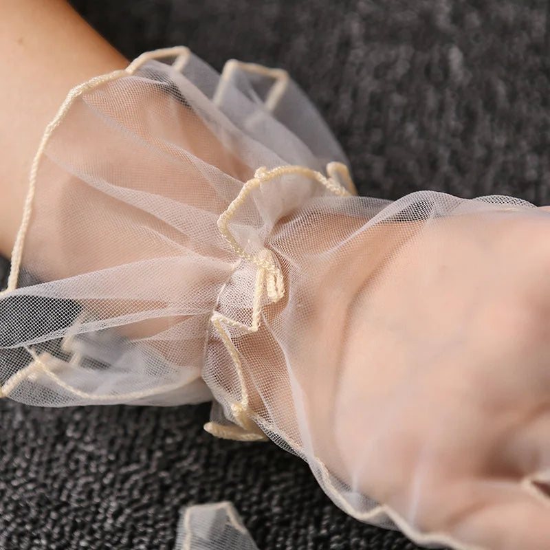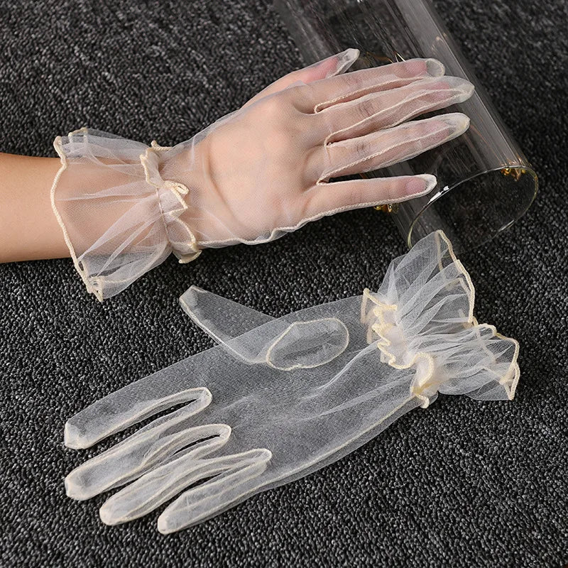 Women Short Tulle Gloves Summer Wedding White Black Elegant Gloves Stretchy Lace Full Finger Mittens Mesh Transparentes Gloves